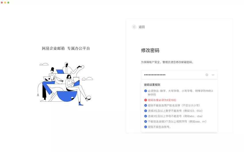 很多用户为了方便记忆,使用简单的数字作为邮箱的密码。企业邮箱总包含着大量的企业各类经营信息,简单的密码容易被人猜破,从而造成企业的机密外泄,对于帐号被盗或者安全管控较高的公司,会设置定制化密码规则,要求员工定期或者强制修改登录密码,避免帐号被盗的风险。