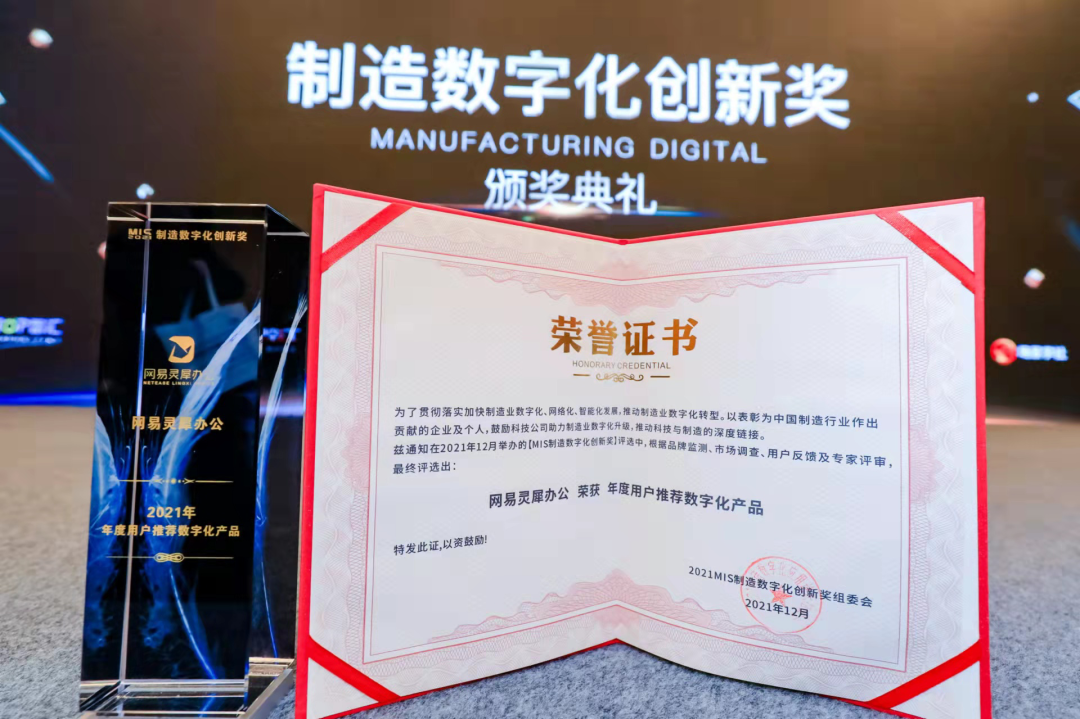 大会在颁奖典礼环节重磅揭晓了“制造数字化创新奖”,为行业树立标杆,帮助更多企业找到数字化实践的最佳路径。此次大会颁奖综合了第三方机构、产业联盟、行业协会以及媒体的多方评审得出,授予网易灵犀办公“2021年度用户推荐数字化产品”奖。