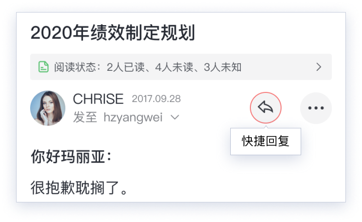 邮件消息快捷回复功能,一键回复高效便捷,满足企业用户双向反馈高效触达的需求。