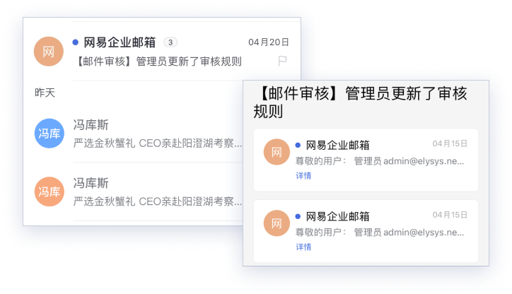 网易灵犀办公的邮件管理功能可以智能分类整理邮件信息,同主题邮件自动归类,多级文件夹细致整理,“待办任务”一目了然,有效节省邮件处理时间,让精力聚焦于重要事情之上。