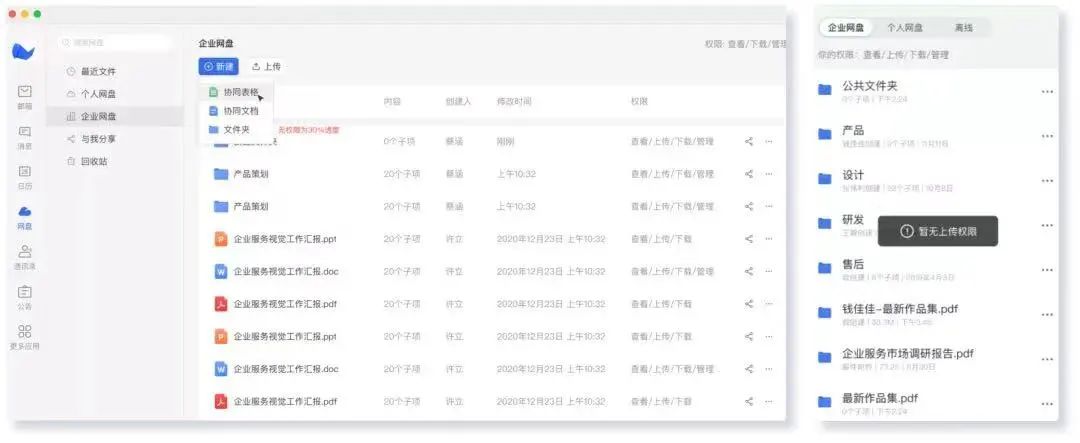 网易灵犀办公的云文档功能可以根据需求多人协同在线编辑文档,实时保存,分享安全,便于沉淀企业数据资产,打造触手可及的“数字图书馆”。另外,文档和邮件附件的相互打通,解决了下载邮件附件到桌面还要定期整理的问题。