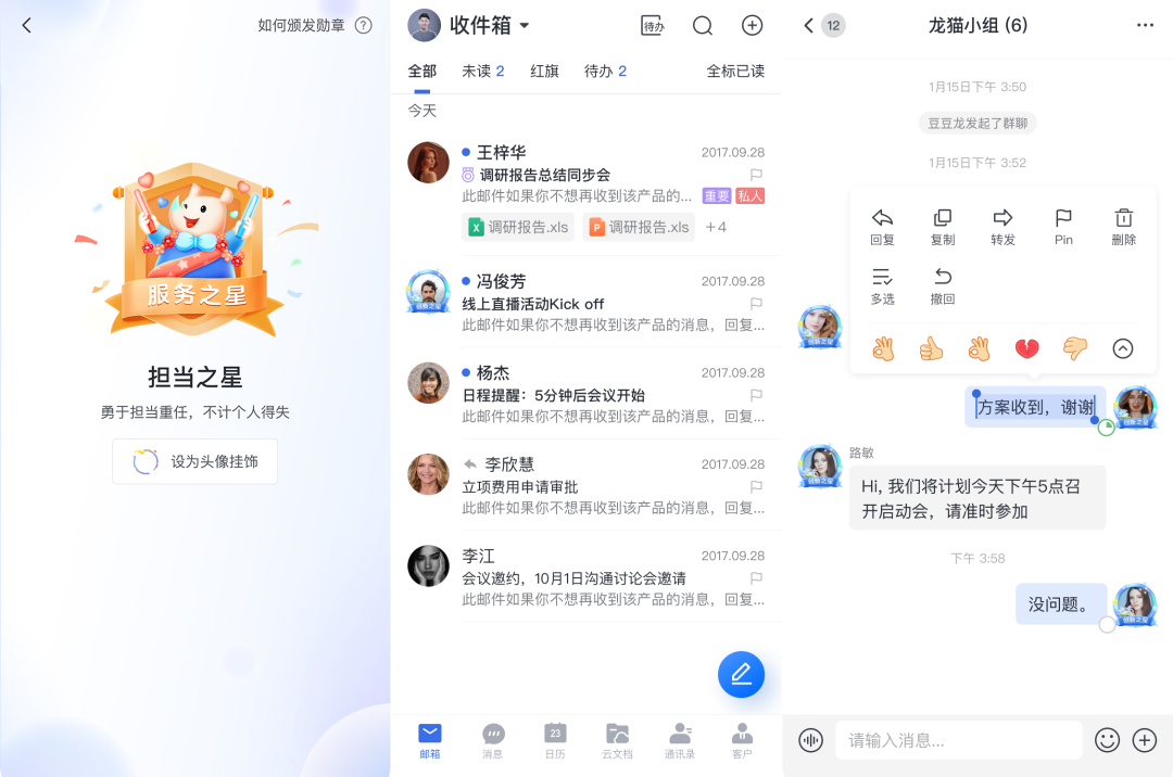 作为企业运营管理的重要工具,邮箱的智能化为企业管理者提供了更好的管理方式。网易灵犀办公全新推出【表扬邮件】功能,表扬邮件与企业勋章相结合,更加多元化、年轻化的表扬方式不仅让员工向往得到这种形式的鼓励嘉奖,更重要的是能够帮助企业打造更好的团队氛围和企业文化。